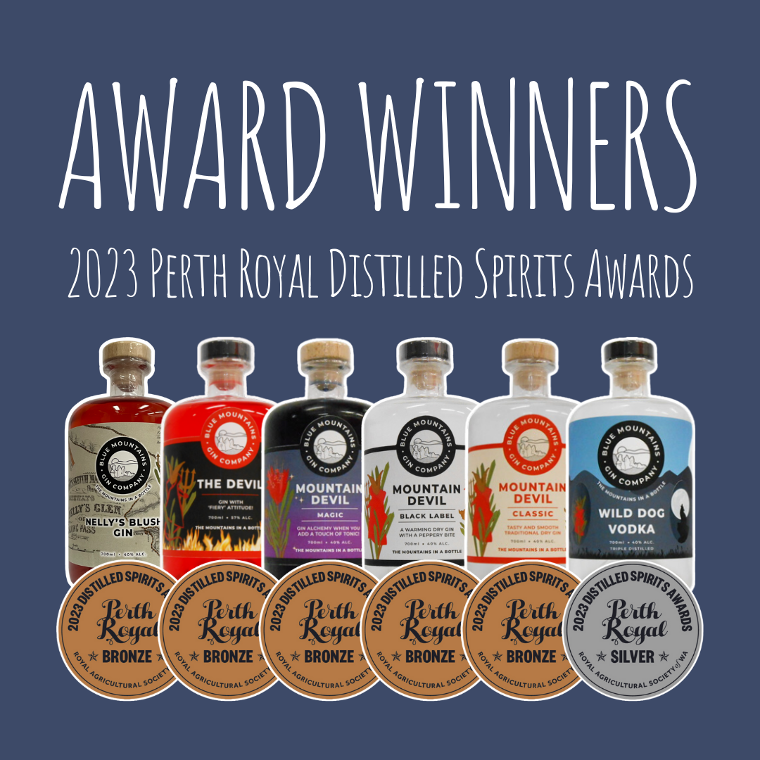 Blue Mountains Gin Company has won six prestigious awards at the 2023 Australian Distilled Spirits Awards (ASDA). Mountain Devil Classic gained Gold for the London Dry category- two years in a row!!, Mountain Devil Magic gained Silver in the Contemporary Gin category, Mountain Devil Black Label gained Bronze in the Contemporary Gin category, our Wild Dog Vodka gained Bronze in the Pure Neutral Vodka category. Two new varieties also gained awards- Nelly's Blush Gin and The Christmas Spirit gained Bronze Awards!! The ASDA are judged by Australia's leading specialists in spirits and provide distillers with an essential benchmarking opportunity.